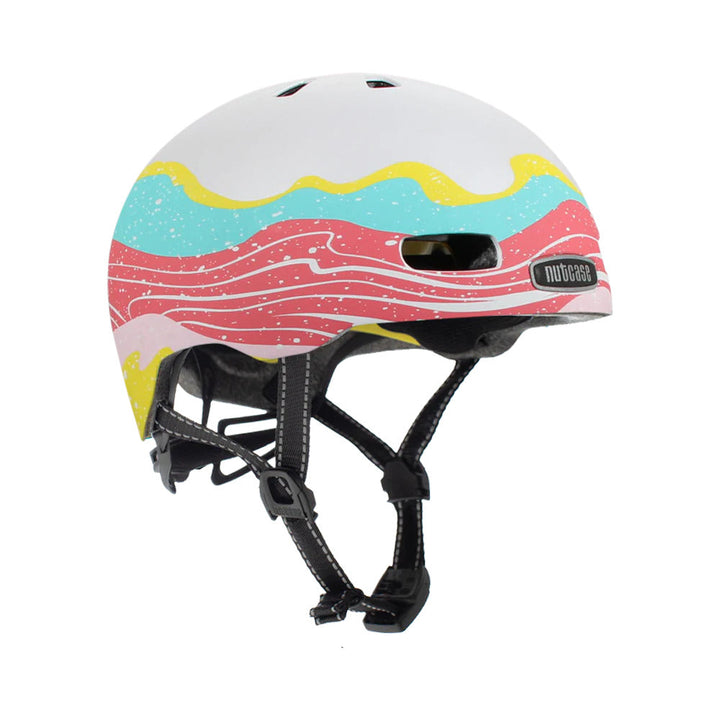 Don't kill your vibe with this vibrant helmet. With metallic flakes on top and cool waves down below, this one is definately a beauty.Nutcase sets the standard for fun when it comes to kid’s helmets. The all-new Little Nutty raises the bar again featuring industry safety leader MIPS in addition to being filled with protective Crumple Zone EPS foam. Now offered in two sizes, the Little Nutty ensures ultimate fit and comfort for kids ages 3 and up. With 15 new designs and 11 contoured air vents, we not only want kiddos to look cool, we want them to remain cool. Durable Injection molded ABS shell with engineered Crumple Zone EPS protective foam featuring MIPS Safety Protection New improved visor included! 10 contoured vents for ultimate cooling Snap and go, No-Pinch Fidlock Magnetic closure Heat sealed, 3-piece pad set / GROW Flex Fit System cradles and ensures safety, individual fit and comfort and 360 degree reflectivity via logos and fit system Toddler ( 48cm - 52cm ), Youth ( 52cm - 56 cm ) ASTM F1492 Certified Complies with U.S. CPSC Safety Standard for Bicycle Helmets for Persons Age 5 and Older