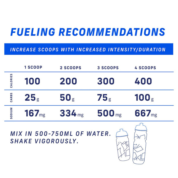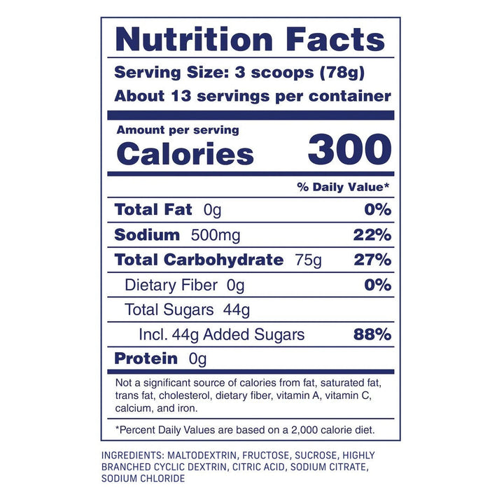 The perfect all-in-one drink mix for all of your activities. This simple, effective, and extraordinarily light tasting drink mix delivers 75 grams of carbs, 300 calories, and 500mg of sodium per serving.This high carb and high sodium drink mix comes in a stand-up pouch containing 1,000 grams of carbs or a single-serving sachet containing a full serving size.Ingredients:Maltodextrin, Sucrose, Fructose, Highly Branched Cyclic Dextrin, Citric Acid, Sodium Citrate, Sodium Chloride
